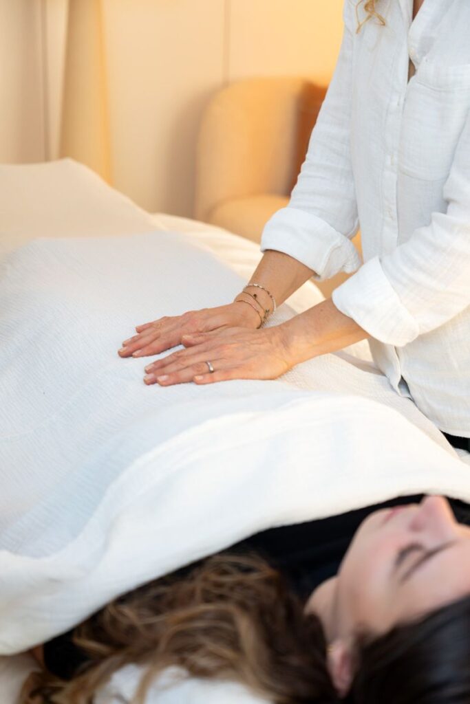 Après un temps d’ancrage, je pose délicatement mes mains à différents endroits du corps. Si vous préférez ne pas être touché-e, mes mains peuvent rester légèrement au-dessus du corps.